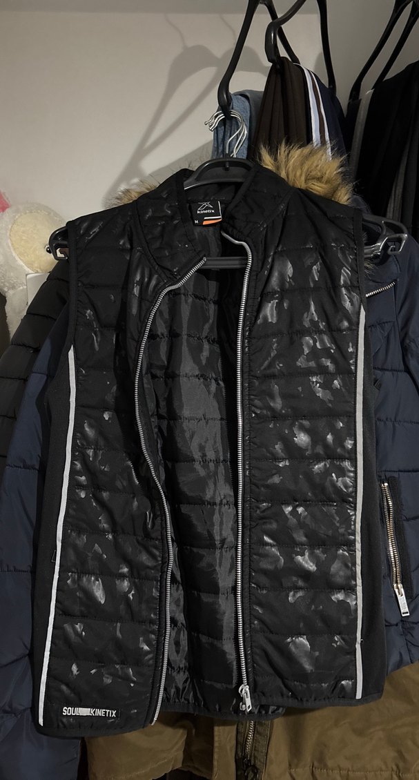 Siyah renkli, fermuarlı ve kolsuz yelek, sentetik kumaştan üretilmiş, kesimi rahattır ve normal midi uzunluktadır.