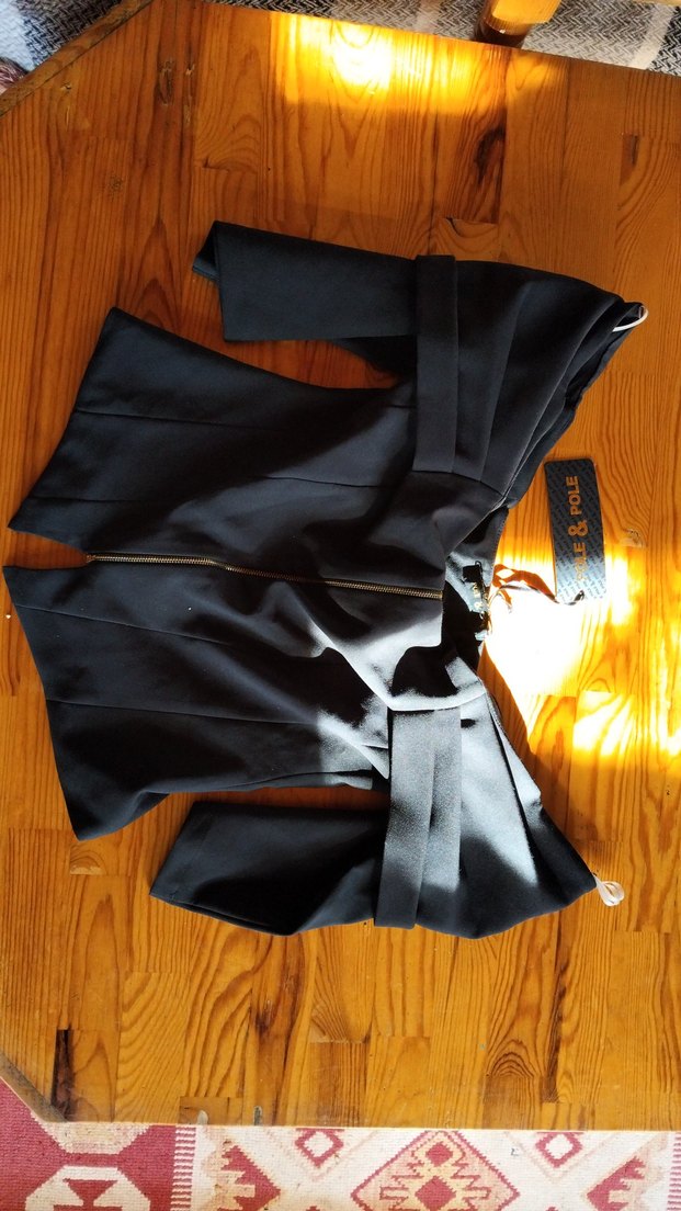 Siyah , vücuda oturan üst .Pürüzsüz sentetik kumaştan, ofis için uygun gotik-avangart tarzda.