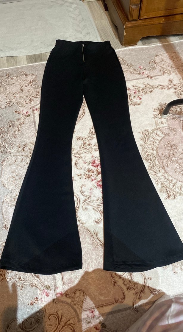 Uzun boy, siyah bol paça pantolon, ön fermuarlı ve vücuda oturan kesime sahip. Kaygan sentetik kumaştan üretilmiş, gotik ve sokak modasına uygun. Günlük kullanıma uygundur.