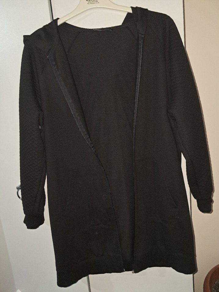Siyah renkli, uzun boylu, fermuarlı, bol kesim hırka. Uzun kollu ve yakası kesik detaylıdır, sentetik kumaştan üretilmiştir.