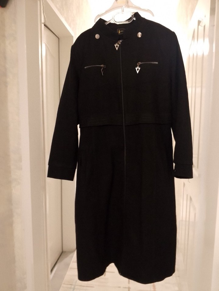 Siyah uzun kaban, fermuarlı cepler ve keskin yaka detaylarıyla gotik tarz sunar. Yumuşak kumaştan, ofis için uygun, rahat kesim ve uzun kolludur.