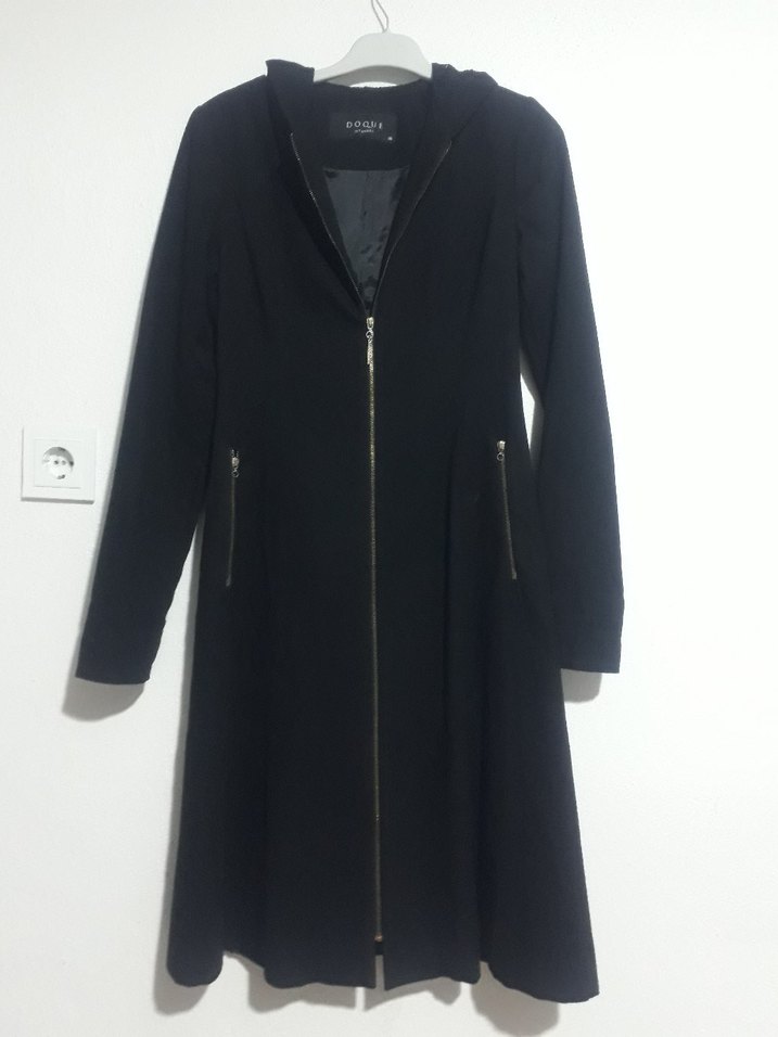 Uzun siyah kaban, Fermuarlı ön ile ceplere sahiptir. Arkada detayi bulunup kapuşonludur. Kaşe kumaş ve astarlıdır. Regular fit, uzun kollu ve yumuşak, sıcak kumaştan üretilmiştir, günlük şık ofis tarzı için uygundur.