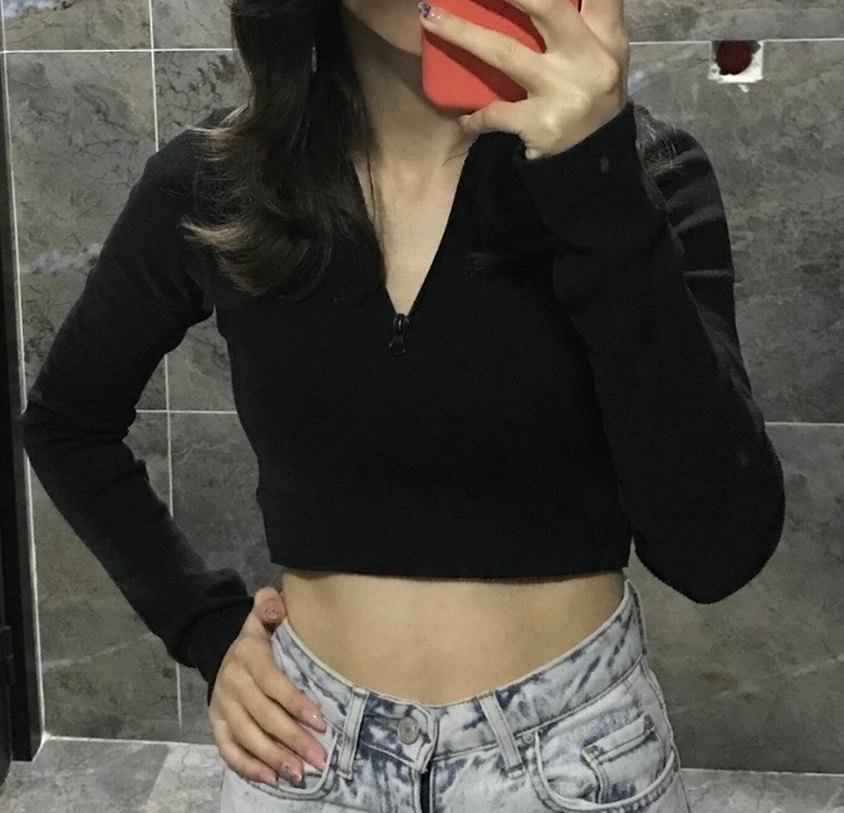 siyah, fermuarlı ve uzun kollu crop top. Boyu benim giyebileceğimden kısa olduğu için ben altındaki lastiğini açtırdım isterseniz diktirip de gönderebilirim.( fotoğraftaki açılmış hâli)
