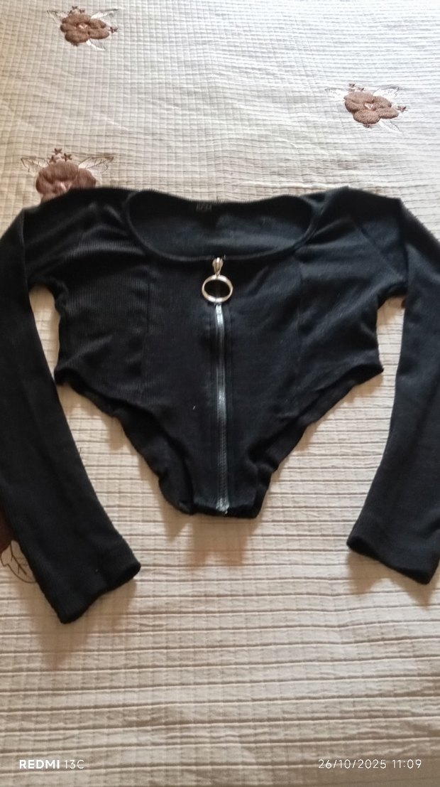 Dar kesim, uzun kollu siyah crop top, yuvarlak yaka ve önünde halka fermuar bulunur. Sentetik kumaştan yapılmıştır, gotik tarzı yansıtır.