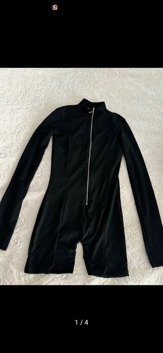 Siyah, uzun kollu, yüksek yakalı ve ön fermuarlı, vücuda oturan midi uzunluğunda jumpsuit. Düz ve sentetik kumaştan yapılmıştır. Şık ve modern tarz için uygun.