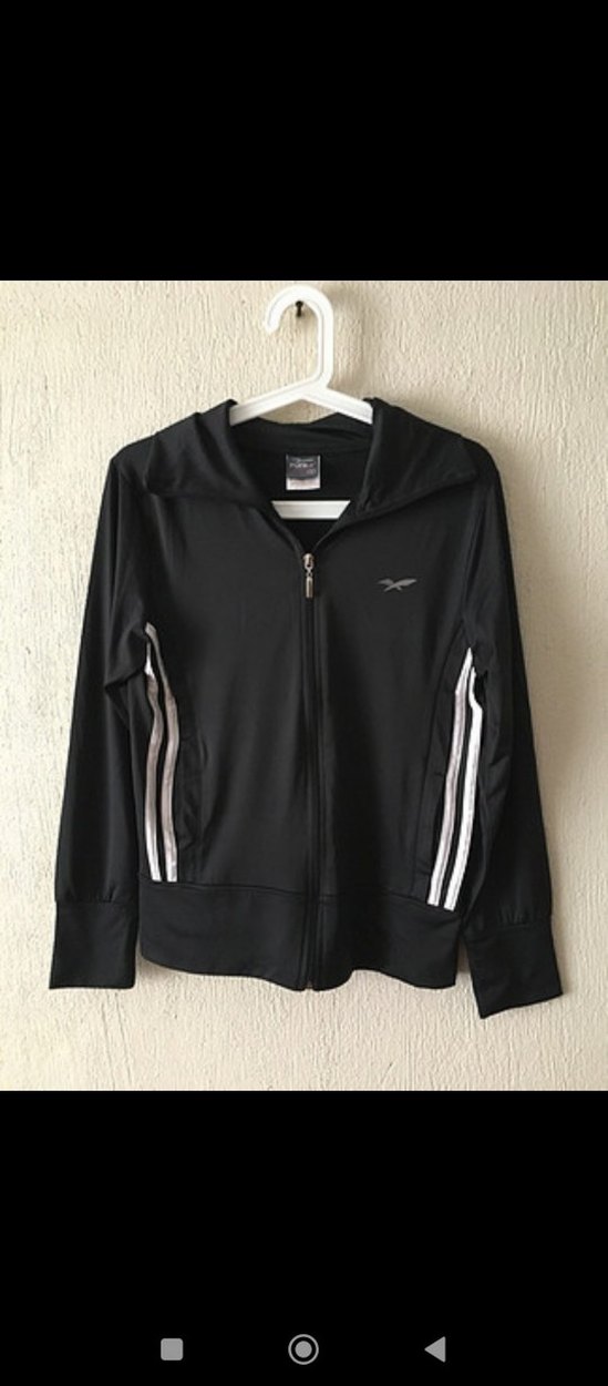 Siyah uzun kollu, yüksek yakalı ve fermuarlı kadın ceket. Beyaz yan çizgili, soft ve sıcak dokulu, günlük sokak giyimine uygun.