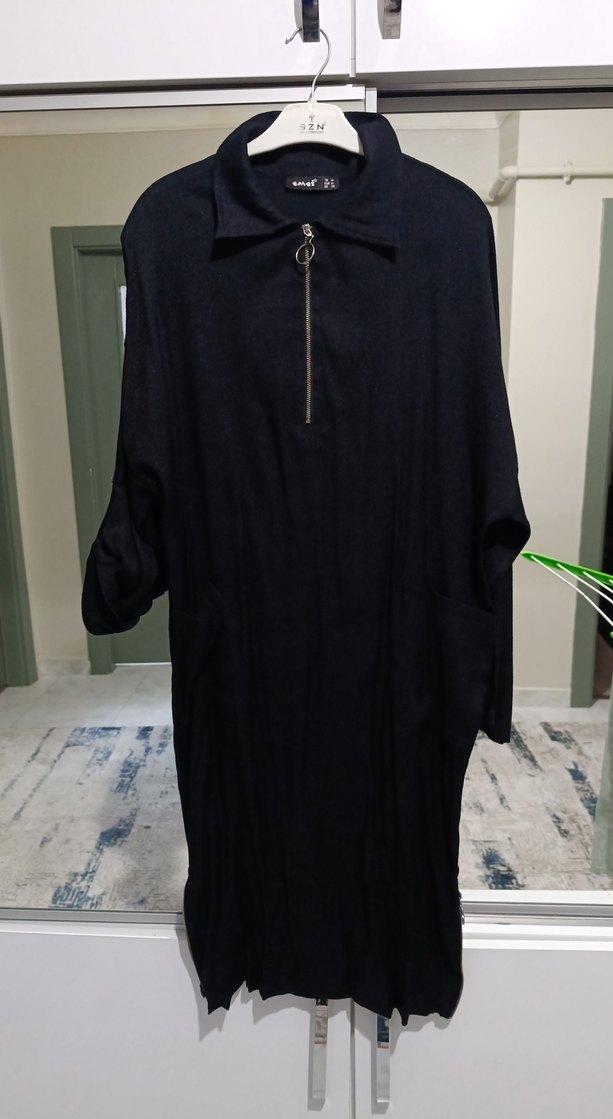 Yumuşak ve sıcak kumaştan yapılmış, yüksek yakalı fermuarlı uzun kollu siyah tunik. Rahat ve bol kesim, günlük ve sokak stiline uygun.