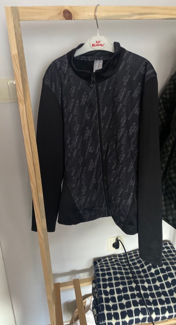 Siyah, fermuarlı ve yüksek yakalı bu spor ceket, sentetik kumaştan üretilmiş ve baskılı desene sahip. Normal midi uzunluğunda ve günlük kullanım için uygun.