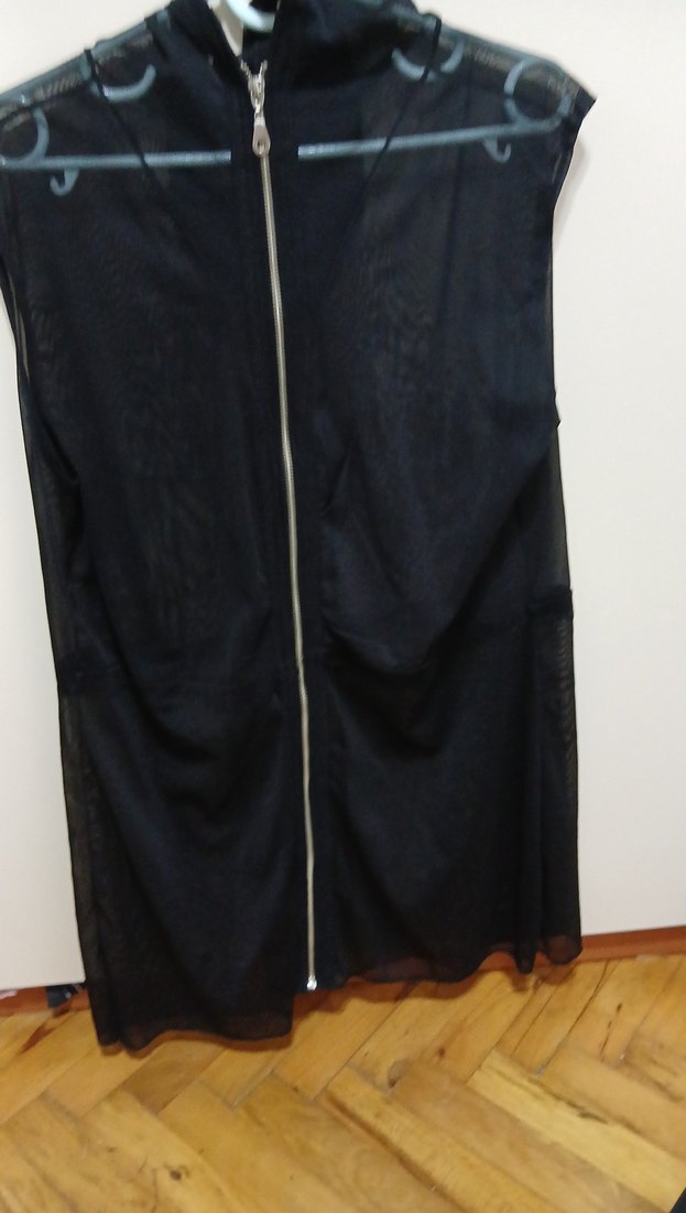 Fermuarlı, uzun boy, kolsuz, V yakalı siyah dar kesim kimono. Gotik tarzda günlük kullanım için uygundur.