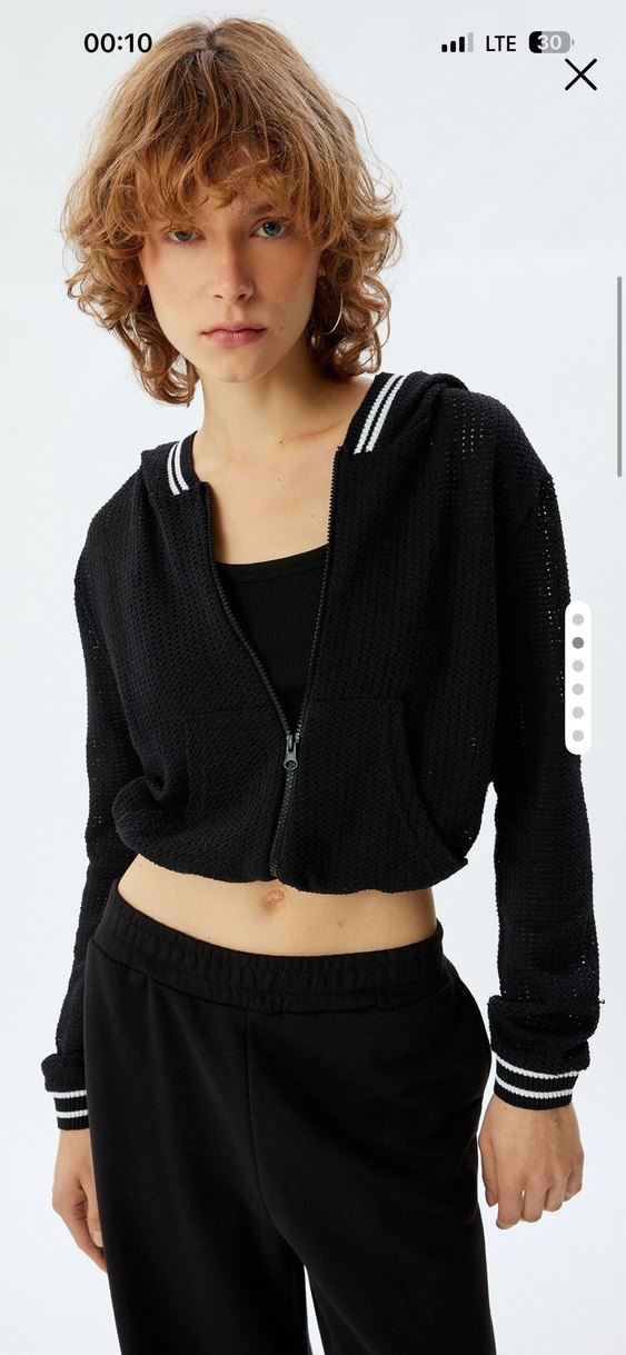 Siyah, fermuarlı, V yaka, uzun kollu, kısa kesim sweatshirt. Nefes alabilen sentetik kumaştan üretilmiştir, günlük kullanım için uygundur.