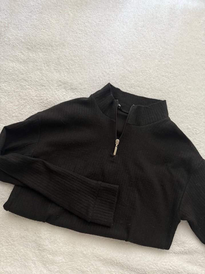 Fermuarlı yüksek yaka ve uzun kollu, siyah, yumuşak dokulu kadın kazak. Rahat ve şık, günlük kullanıma uygun. Hiç giyilmedi temizdir.