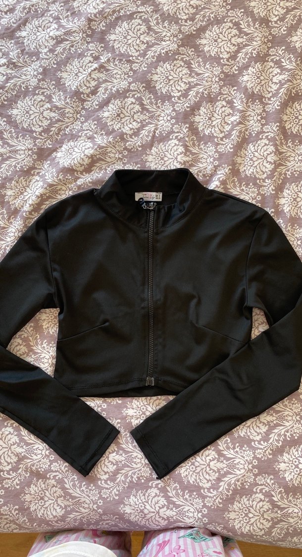 Fermuarlı, uzun kollu ve yüksek yakalı siyah crop ceket, şık ve rahat bir görünüm sağlar. Sentetik kumaştan üretilmiştir.