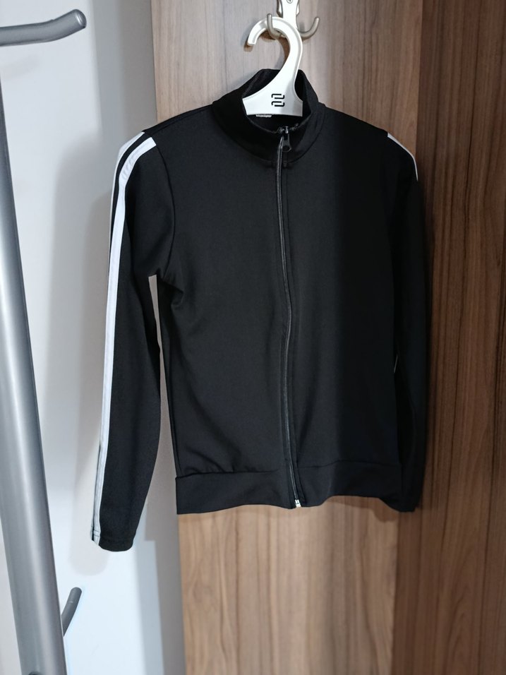 Siyah, yüksek yakalı, uzun kollu ve fermuarlı bu dar kesim ceket, kollarında beyaz şerit detaylarıyla spor ve günlük kullanıma uygundur. hiç kullanılmadı ✨