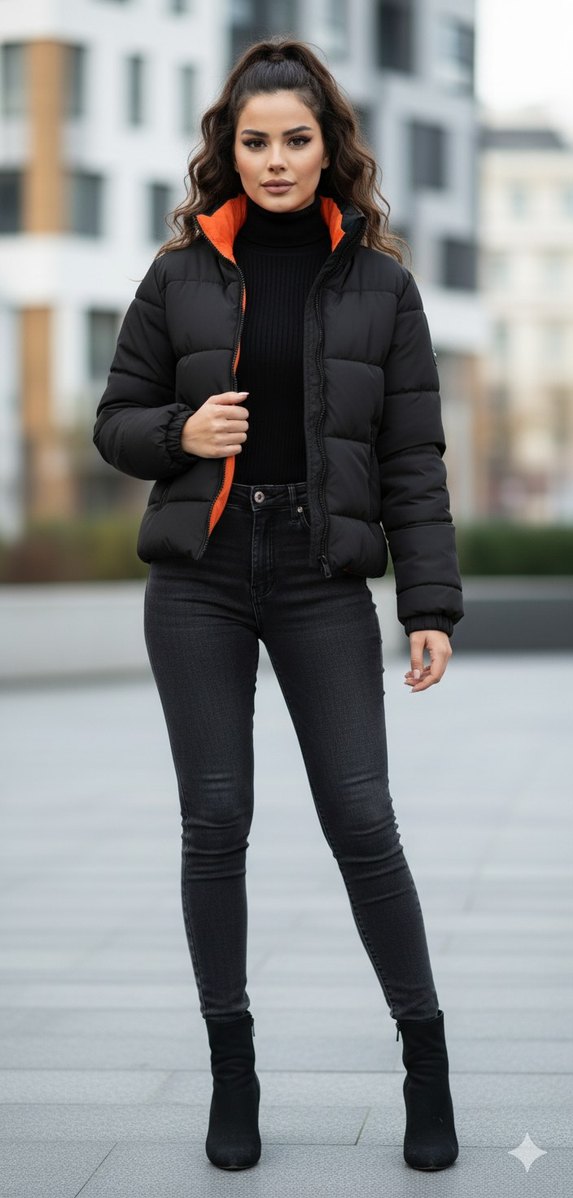 Siyah, yüksek yakalı ve uzun kollu, fermuarlı cepleri ve ön kapaması olan, dış mekan için uygun yumuşak ve sıcak kumaştan yapılmış dar kesim mont.