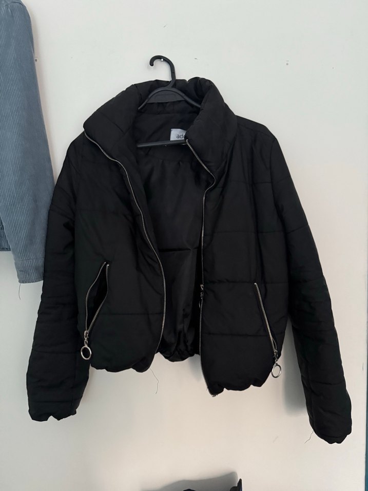 Fermuarlı cepleri ve yüksek yakası olan siyah, ince kesim mont, yumuşak ve sıcak dokusuyla günlük sokak stili için uygundur.