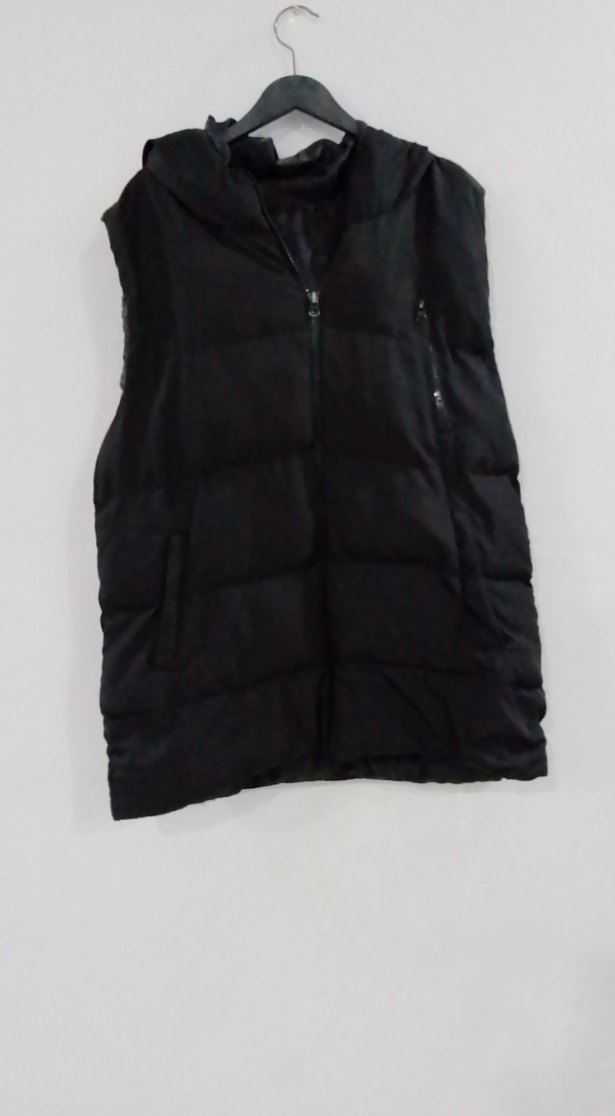 Siyah, yüksek yakalı ve fermuarlı, yumuşak ve sıcak kumaştan yapılmış kolsuz kadın yelek. İnce kesim ve normal boyda, günlük kullanıma uygun. 42 beden yelek