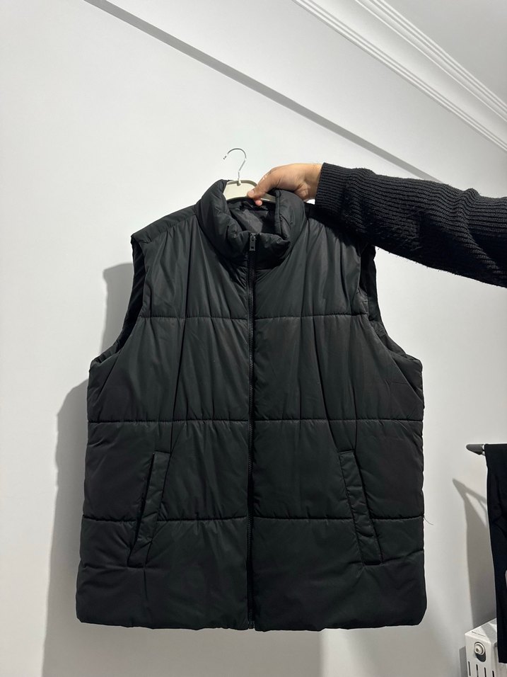 Siyah, fermuarlı, yüksek yakalı ve kolsuz kadın yeleği. Yumuşak ve sıcak kumaştan, bol kesim ve midi boyda, günlük kullanıma uygun minimal tasarım.
