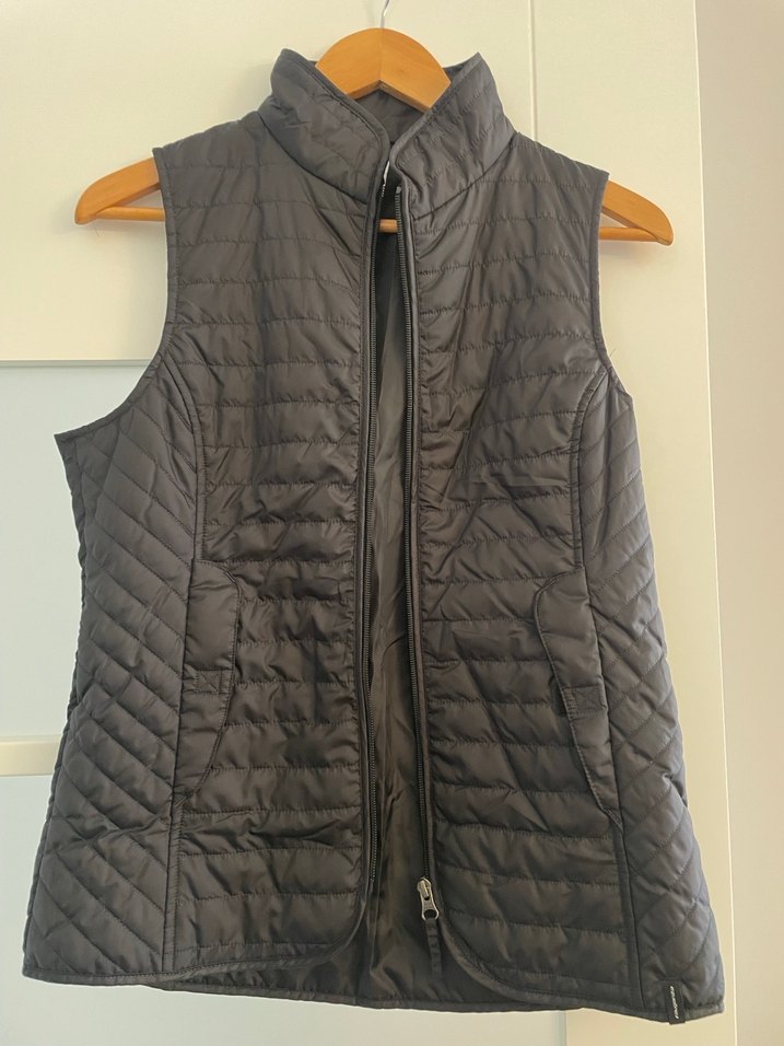 Fermuarlı önü ve yüksek yakasıyla gri, kolsuz yelek. Düz sentetik kumaştan, fitted ve midi boyda, günlük sokak stiline uygun.