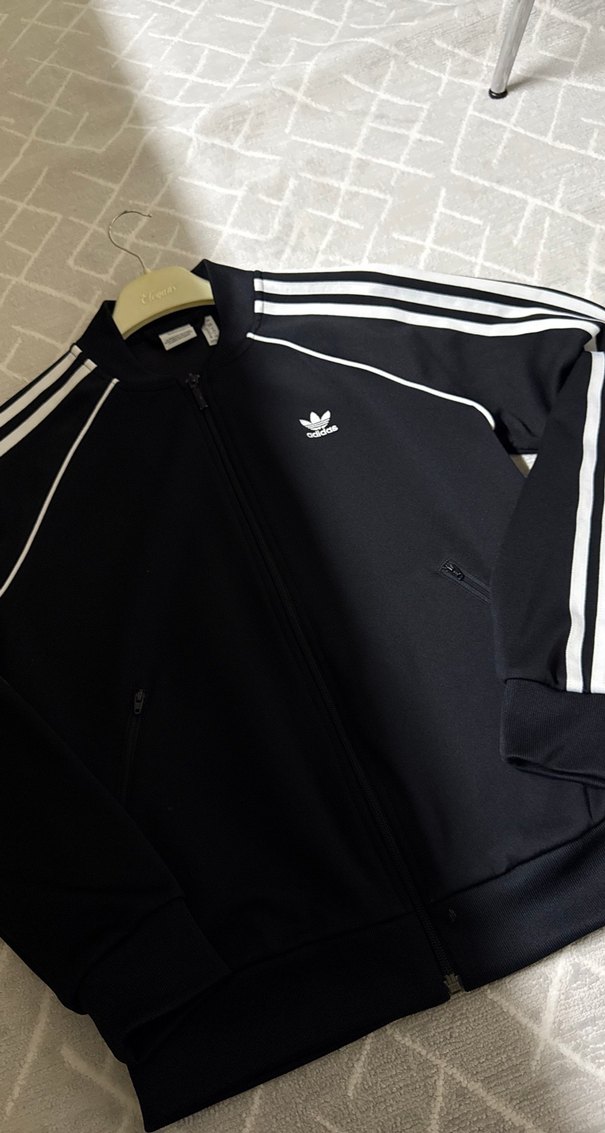 Fermuarlı cepleri, yüksek yakası ve uzun kollu yapısıyla siyah, dar kesim spor ceket. Beyaz şerit detayları ve koyu sentetik kumaşıyla günlük sokak stiline uygun.