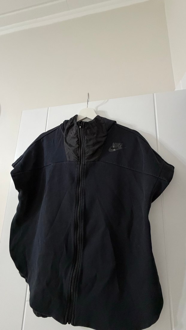 Siyah renkte, yüksek yakalı ve fermuarlı ön kısmı olan, yumuşak ve sıcak kumaştan üretilmiş, fitted kesim ve normal uzunlukta kolsuz spor yelek. Nike markadır