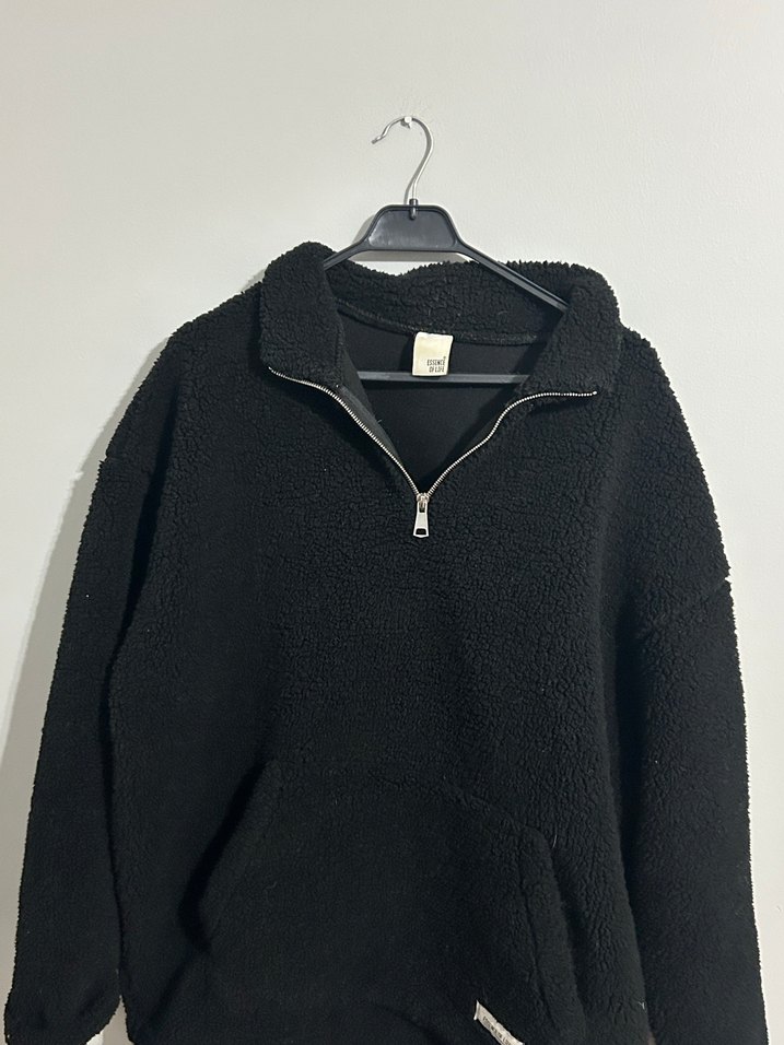 Siyah, fermuarlı, uzun kollu, yüksek yakalı erkek sweatshirt. Rahat ve bol kesim, günlük kullanıma uygun.