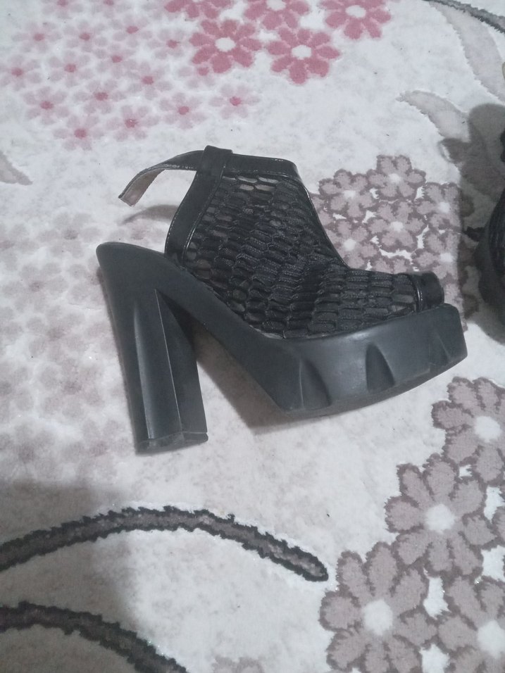 Siyah file desenli, tokalı platform topuklu kadın ayakkabısı. gotik tarzda, günlük kullanıma uygun.
