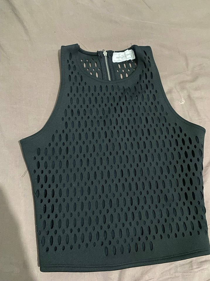 Yüksek yakalı, file detaylı siyah kolsuz crop top. Sentetik kumaştan, sokak stili ve spor şıklığı için uygun.