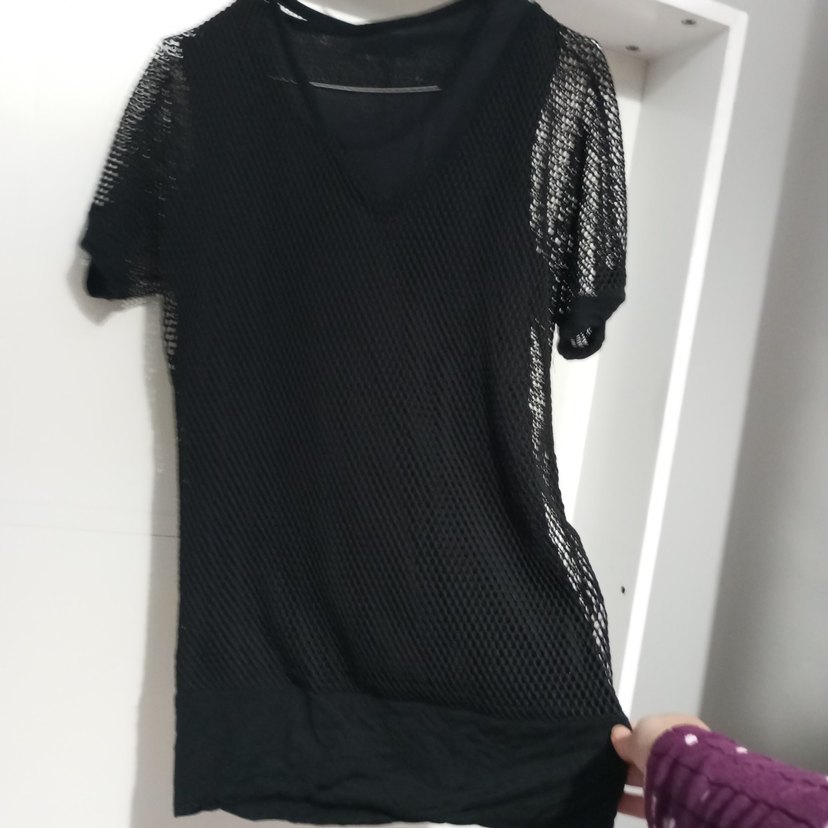 Siyah file Detaylı V Yaka iç siyah atletli file Tişört