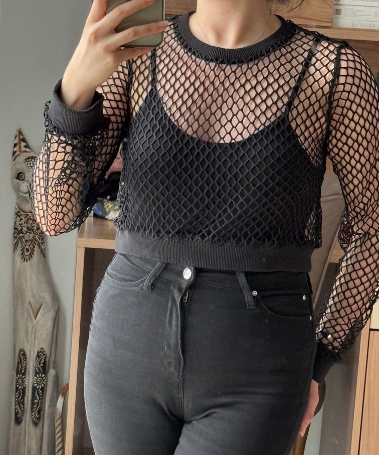 Siyah, fileli ve dantel detaylı, düz kesim, kruvaze yaka, askılı kollu, fit kesim kadın bluz. Günlük kullanıma uygun şık bir parça.1 kez giydim.Kusuru yok.