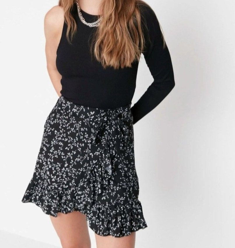 Siyah Fırfırlı Bağlamalı Mini Etek