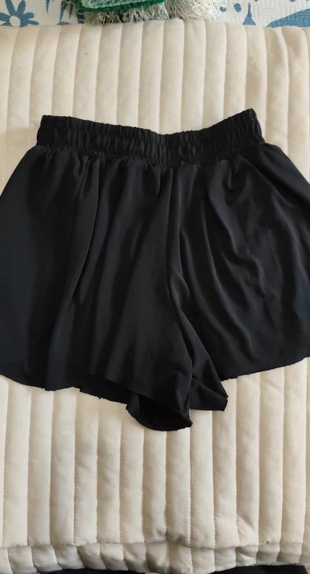 Saten dokulu, fırfırlı ve bol kesim siyah mini şort etek, günlük sokak stili için uygundur.