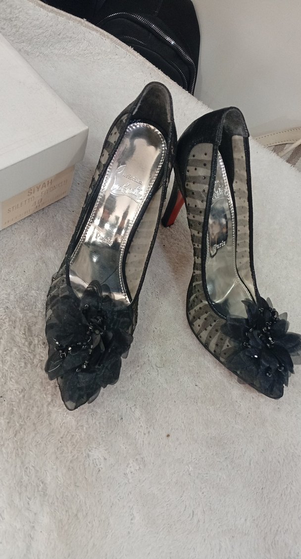 Desenli malzemeden yapılmış, siyah renkli, fırfır detaylı yüksek topuklu kadın ayakkabısı. Gotik tarzda, düğün gibi özel günler için uygun şık bir model.