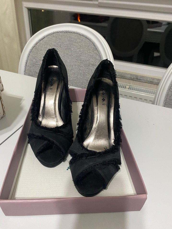 Siyah renkte, dolgu topuklu ve fırfır detaylı kadın gece ayakkabısı. Yumuşak kauçuk malzemeden yapılmış, gotik tarzda, ofis kullanımı için uygun, desensiz tasarım.