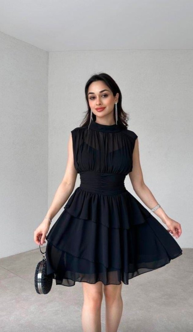 Siyah, yüksek yakalı, kolsuz ve vücuda oturan mini elbise, fırfır detaylarıyla romantik geceye uygun klasik gotik tarz sunar. almıştım düğün iptal olduğu için giyemedim etkiteli hiç giyilmedi açılmadı bana nasıl geldiyse aynı şekilde gönderiyorum Normal güncel fiyatı 1000tlnin üstünde