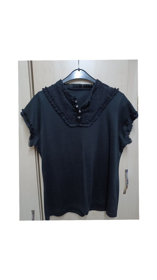 Siyah renkli, fırfırlı yakalı ve kısa kollu, rahat kesim goth tarzı kadın bluz. Günlük kullanıma uygun örme kumaştan yapılmıştır.