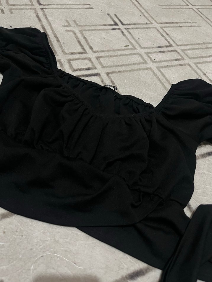 Siyah, tek renk, kayık yaka ve askılı kollara sahip, yumuşak sentetik kumaştan yapılmış, fırfırlı detaylı, gotik tarzda dar kesim bluz. Sırtından bağlamalı