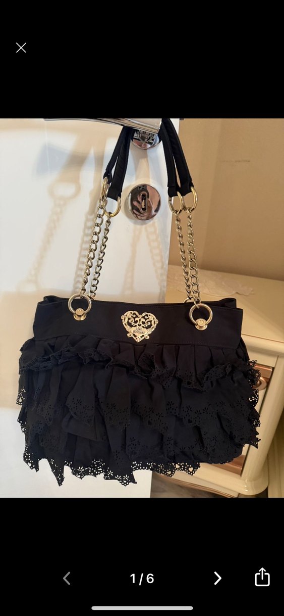 Siyah sentetik kumaştan yapılmış, zincir saplı ve fırfır detaylı gotik kadın çantası. Günlük kullanım için klasik ve zarif tarzda.urun orıjınaldır bütün çantalarım orijinaldir çok az kullanıldı tertemızfır