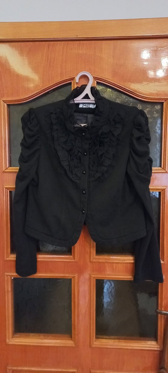 Siyah, uzun kollu, fırfırlı ve yakası kesik detaylı gotik tarzda, keten kumaştan, klasik şıklıkta ofis kullanıma uygun kadın ceketi. 38/40 uyumlu siyah yaka dantel detay kollar drapeli boncuk düğmeli iç astarlı çok şık victorian ceket marka temsilidir tertemiz kusursuz iki kol arası 46cm boy 46cm
