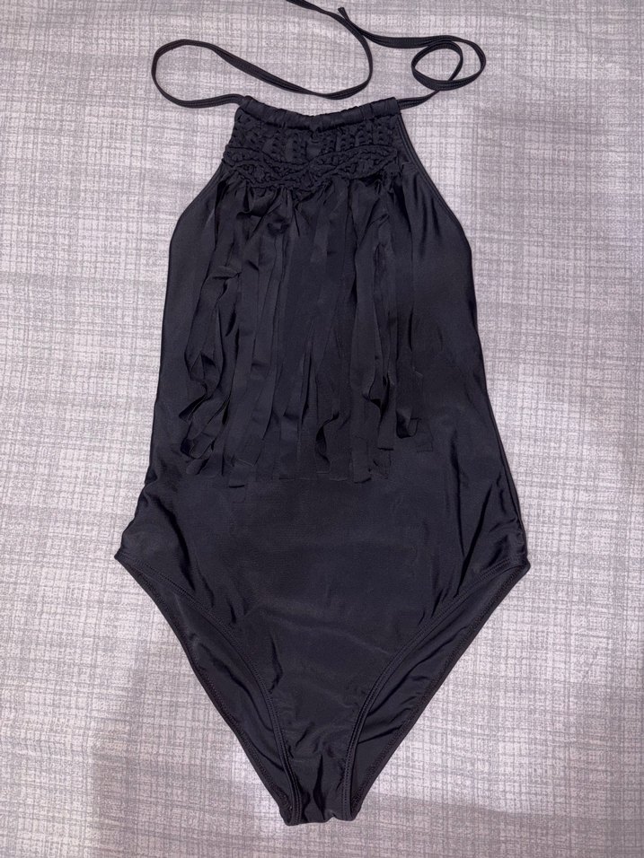 Bu siyah, vücuda oturan mayo, askılı ve fırfırlı detaylara sahiptir. Cesur gotik tarzıyla plaj için uygundur, midi boyda ve desensizdir.