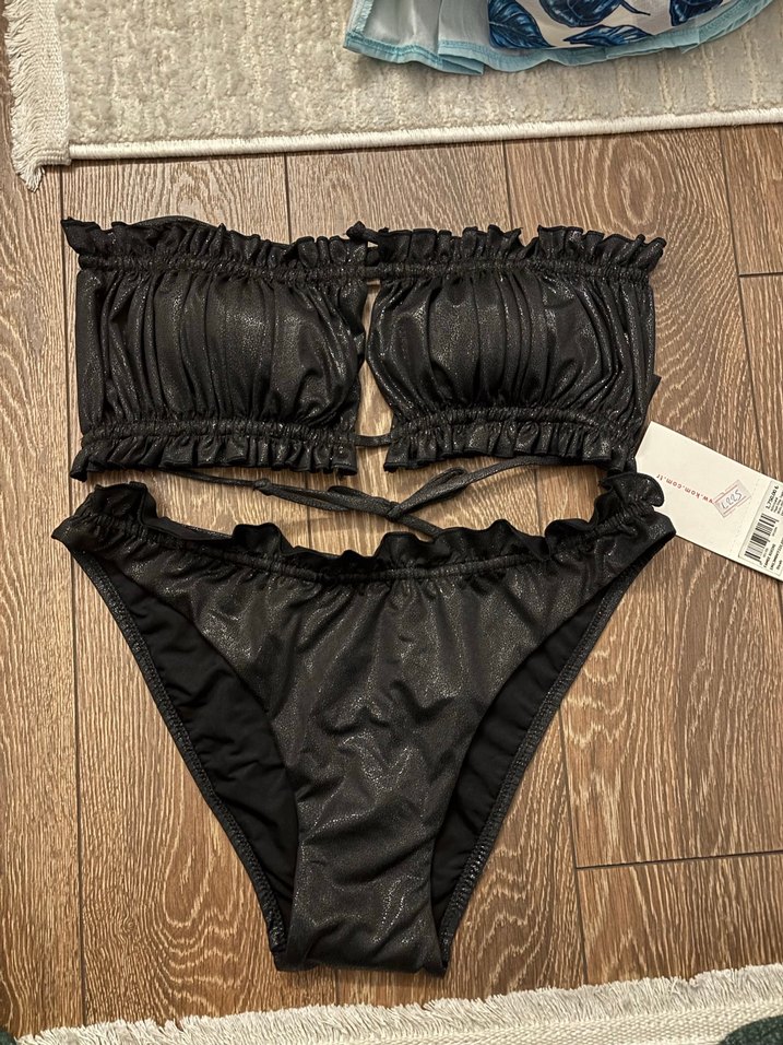 Siyah renkli, fırfırlı ve askılı detaylara sahip, kısa ve vücuda oturan gotik tarzda bikini. Plaj için cesur bir görünüm sunar.