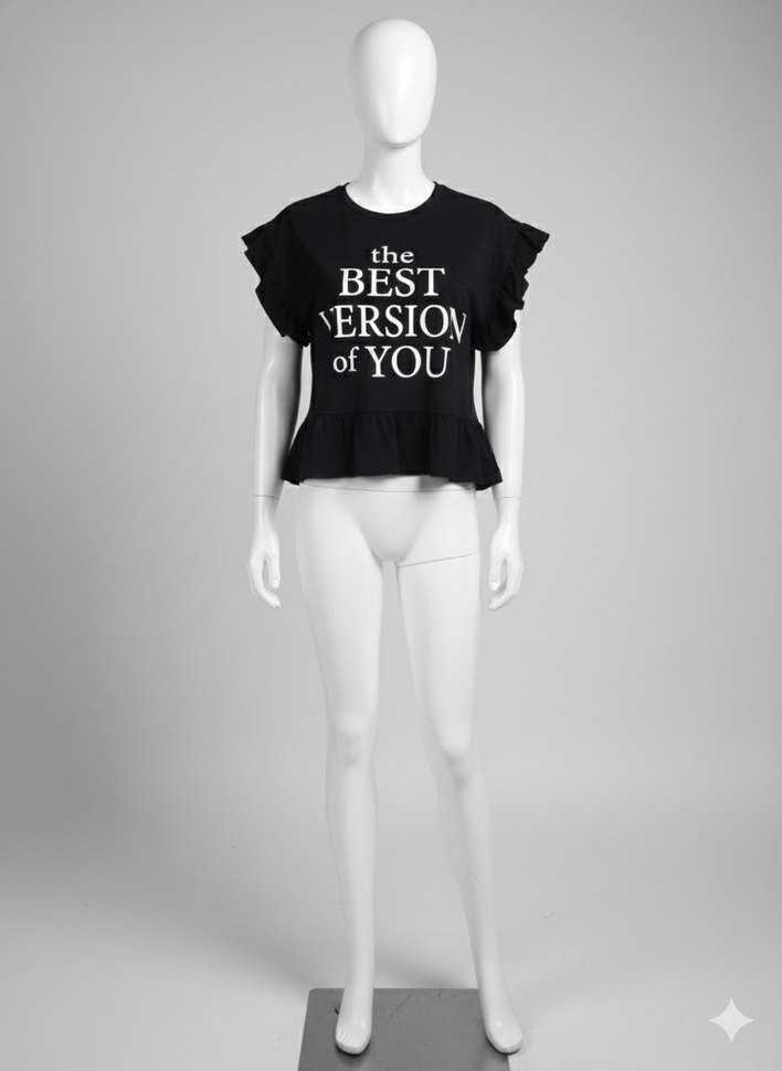 Siyah pamuk hamile tişörtü, yuvarlak yaka, kısa fırfırlı kollu ve bol kısa kesimlidir. Önde baskılı yazı vardır, goth tarzında rahat bir modeldir.