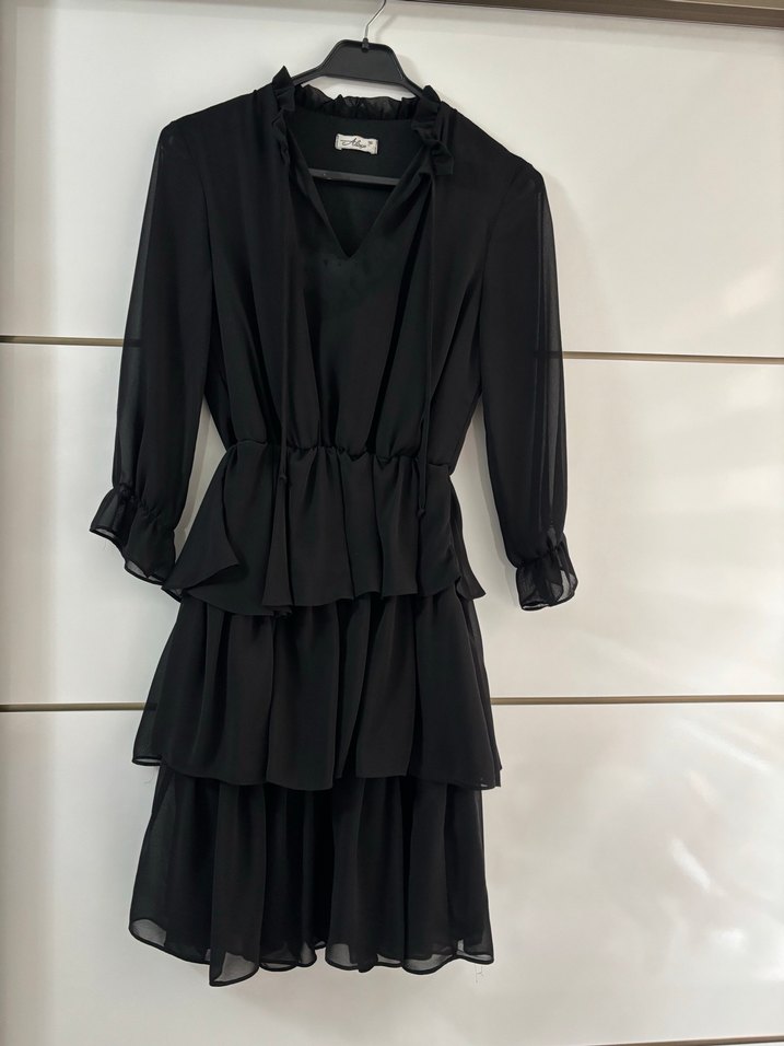 V yakalı siyah elbise, fırfır detayları ve katmanlı tasarımıyla klasik şıklığı gotik dokunuşla birleştirir.