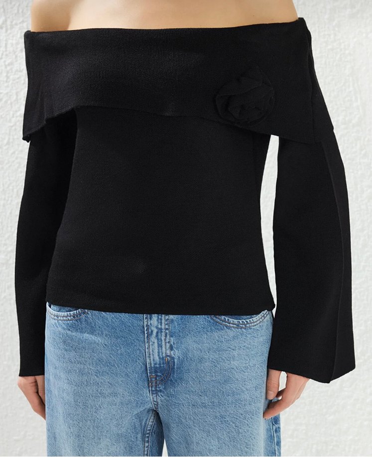 Siyah Fırfırlı Kayık Yaka gül detaylı kazak