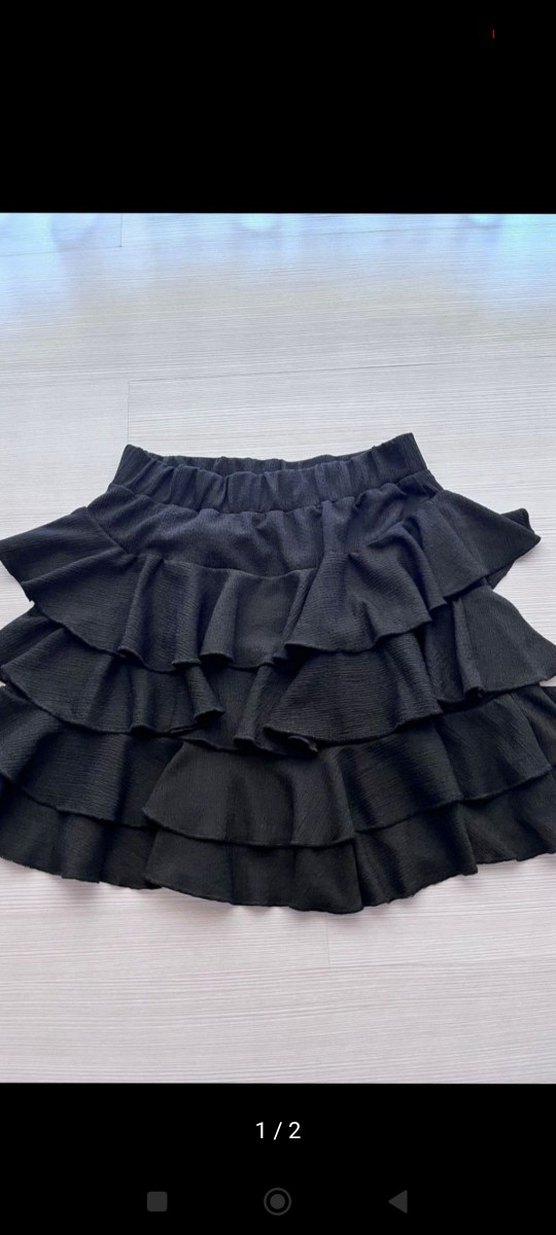 Siyah keten kumaştan, bol kesim ve kat kat fırfır detaylı kısa mini etek, günlük kullanıma uygun sade ve şık tarz sunar.