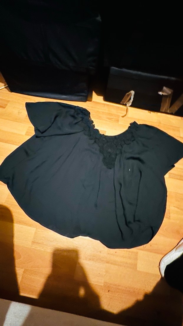 Geniş kesim, siyah renkte, kayık yaka ve kısa kollu bluz. Fırfır detaylı, tül şifon astarlı kumaştan, gotik veya bohem tarzlar için uygundur.
