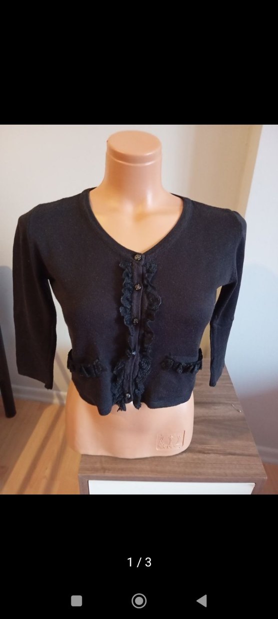 Uzun kollu, V yaka, siyah triko kısa hırka. Fırfır detaylarıyla gotik tarzı yansıtan, günlük kullanıma uygun dar kesim.