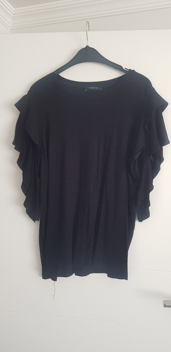 Siyah renkte, yuvarlak yakalı ve kısa kollu fırfırlı bluz. Rahat kesim ve midi boyda, yumuşak sentetik kumaştan üretilmiştir.