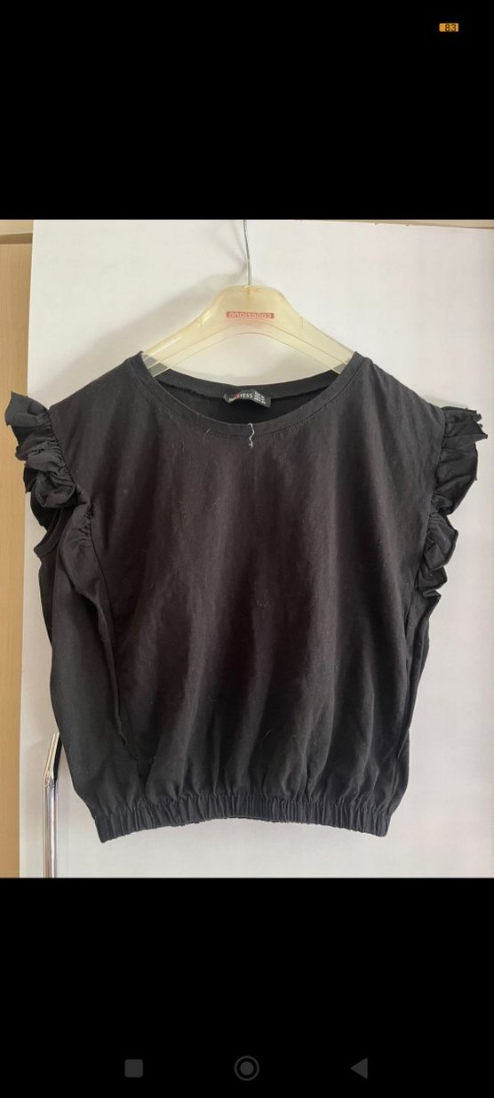Siyah crop top, yuvarlak yaka ve kısa kollarda fırfır detaylarıyla. Hafif keten kumaştan, bol kesim ve kısa boyda, rahat sokak stili için uygun.