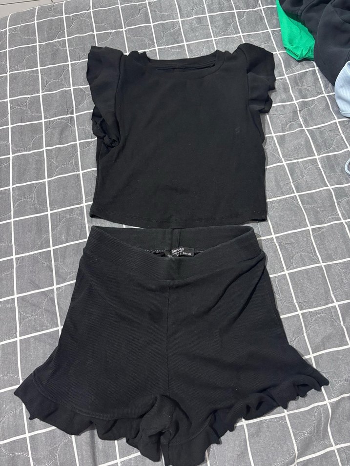 siyah, kısa kollu fırfırlı üst ve fırfırlı şortlardan oluşan rahat bir takım.