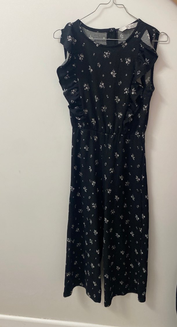 Siyah kolsuz tulum, V yakalı ve fırfır detaylıdır. Yumuşak sentetik kumaş üzerinde ince çiçek deseni bulunur, günlük kullanıma uygundur.
